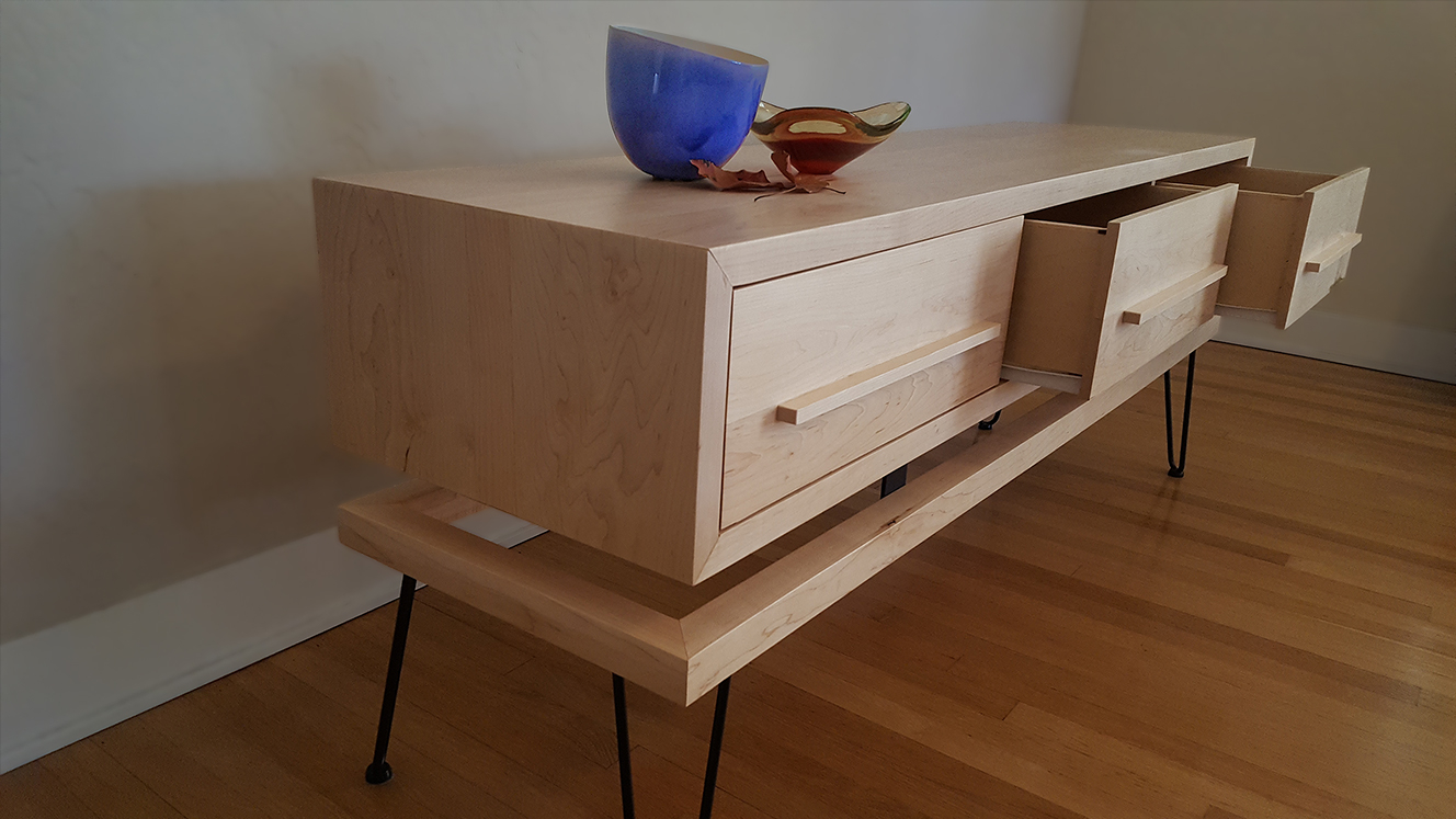 This console table "floats" on top of a lower 4" x 4" white maple frame. The cabinet hosts three drawers with matching wooden pulls.