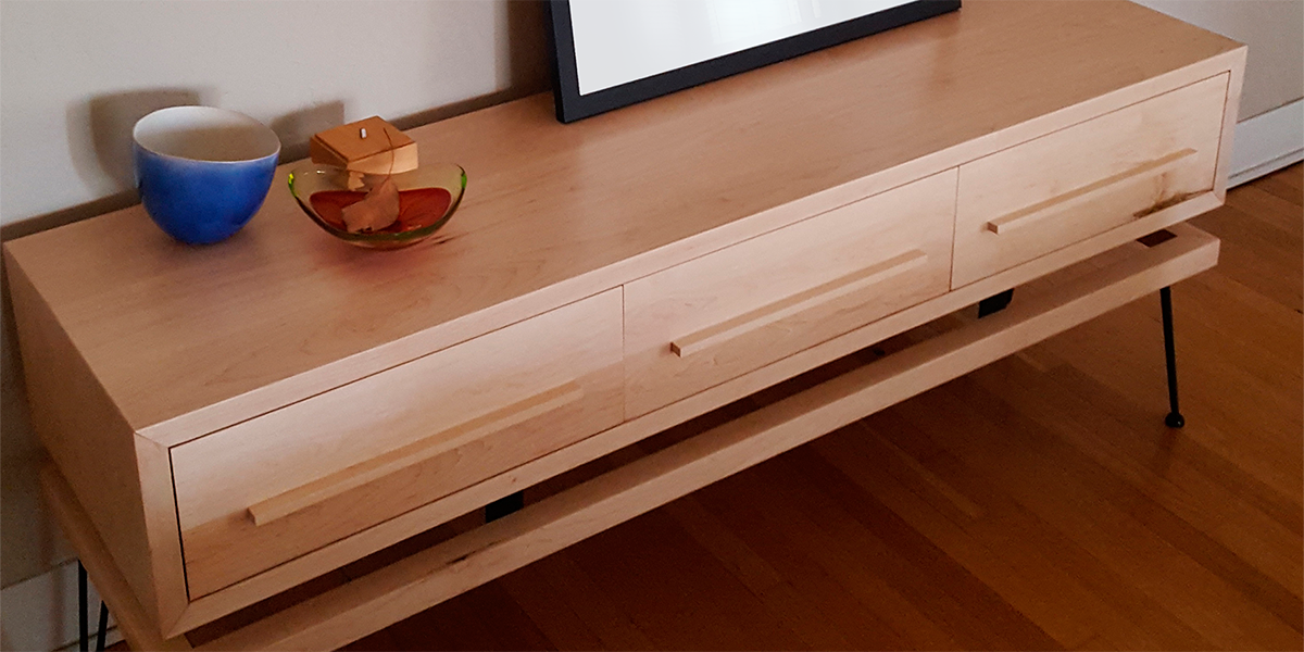 The cabinet "floats" on top of a 4" x 4" white maple frame. It hosts three drawers with matching wooden pulls.
